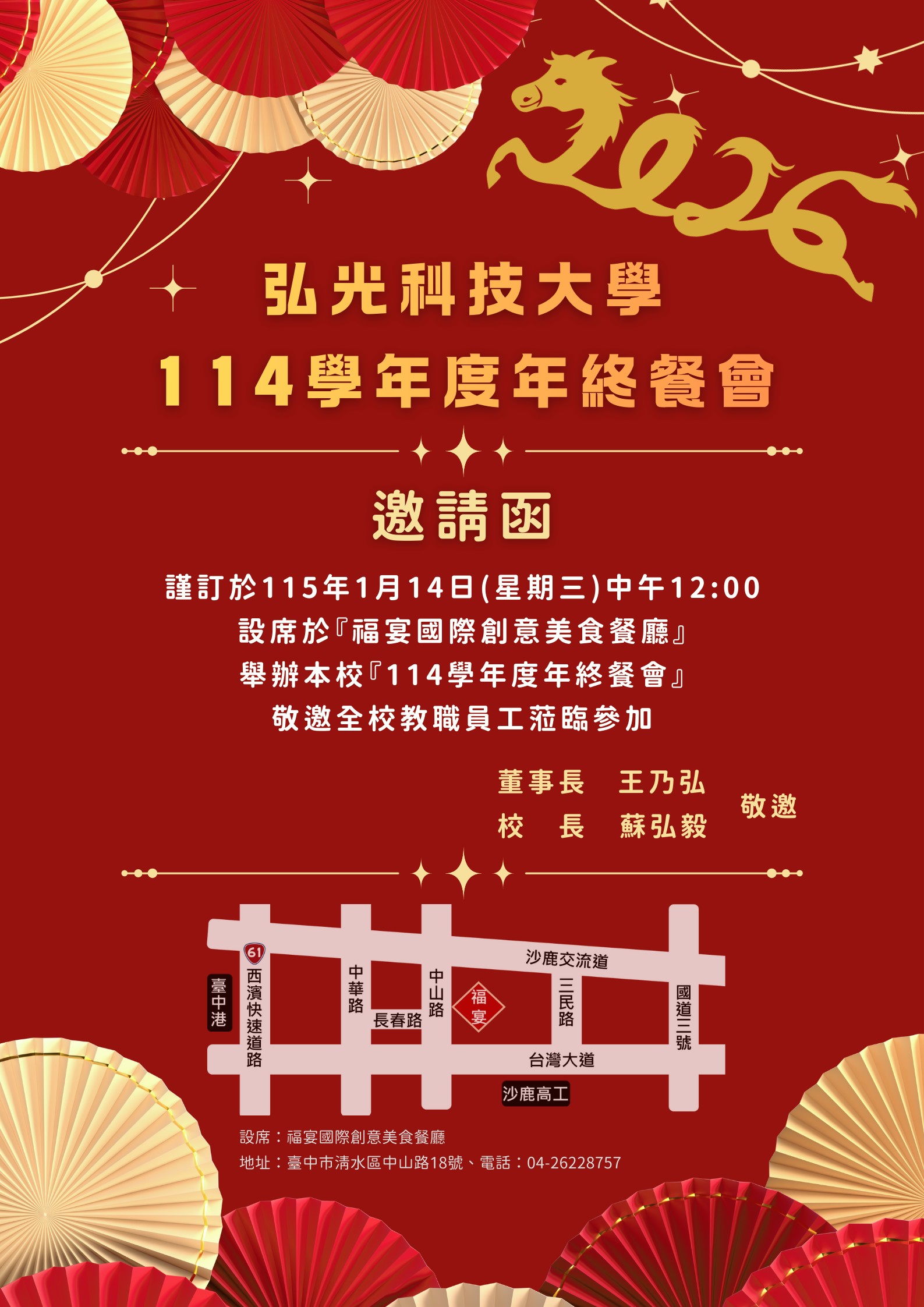 為凝聚教職員向心力,感謝全體同仁一年來的辛勞,本校謹訂於115年1月14日(星期三)中午12:00,設席於「福宴國際創意美食餐廳」,舉辦「114學年度年終餐會」活動,敬邀全校教職員工蒞臨參加~